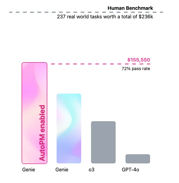 With AutoPM enabled, Genie scores a record-breaking 72% on the SWE-Lancer Diamond Eval, earning $155,550.