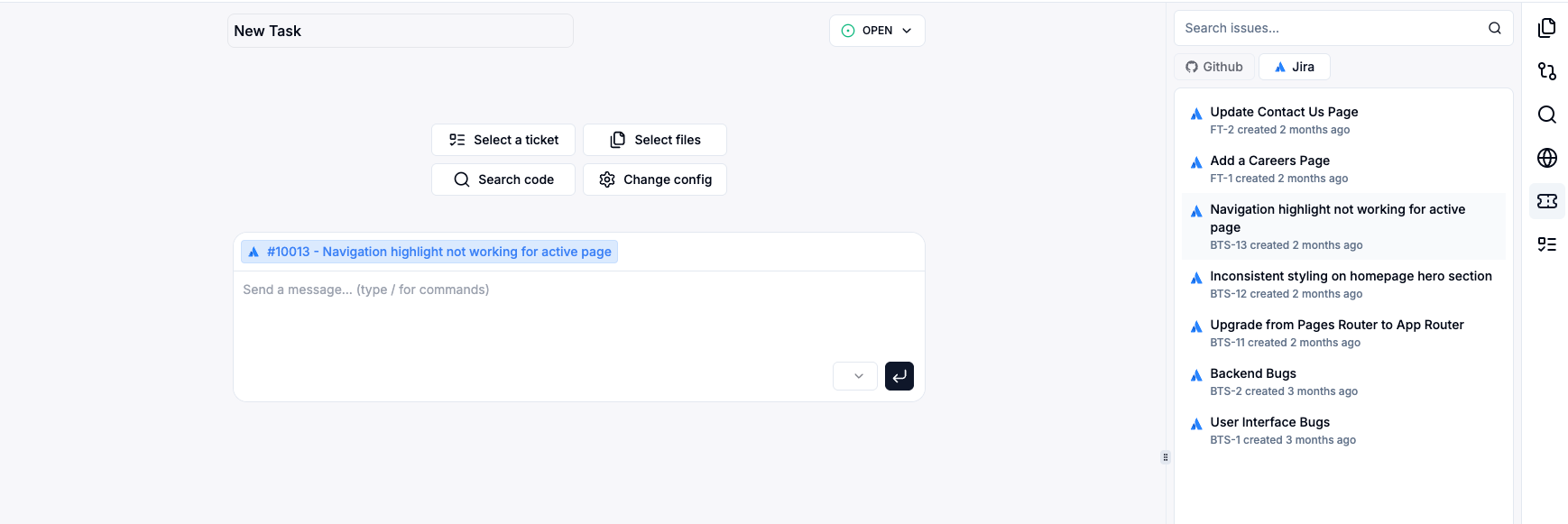 Section titled “How it works”With the Jira integration enabled, you can easily initiate Cosine tasks: