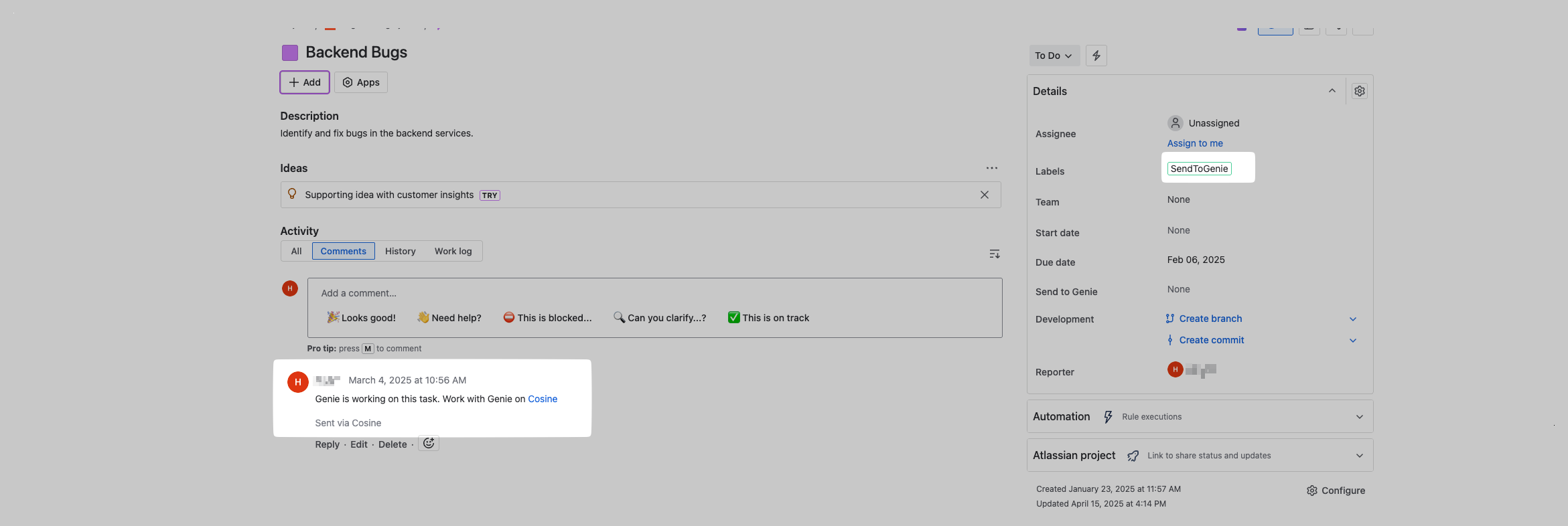 - Adding this label to any Jira issue automatically creates a Cosine task using the issue’s context. Cosine will also post a comment in the Jira issue with a link to the newly created task, so everyone can track progress or jump into Cosine as needed.