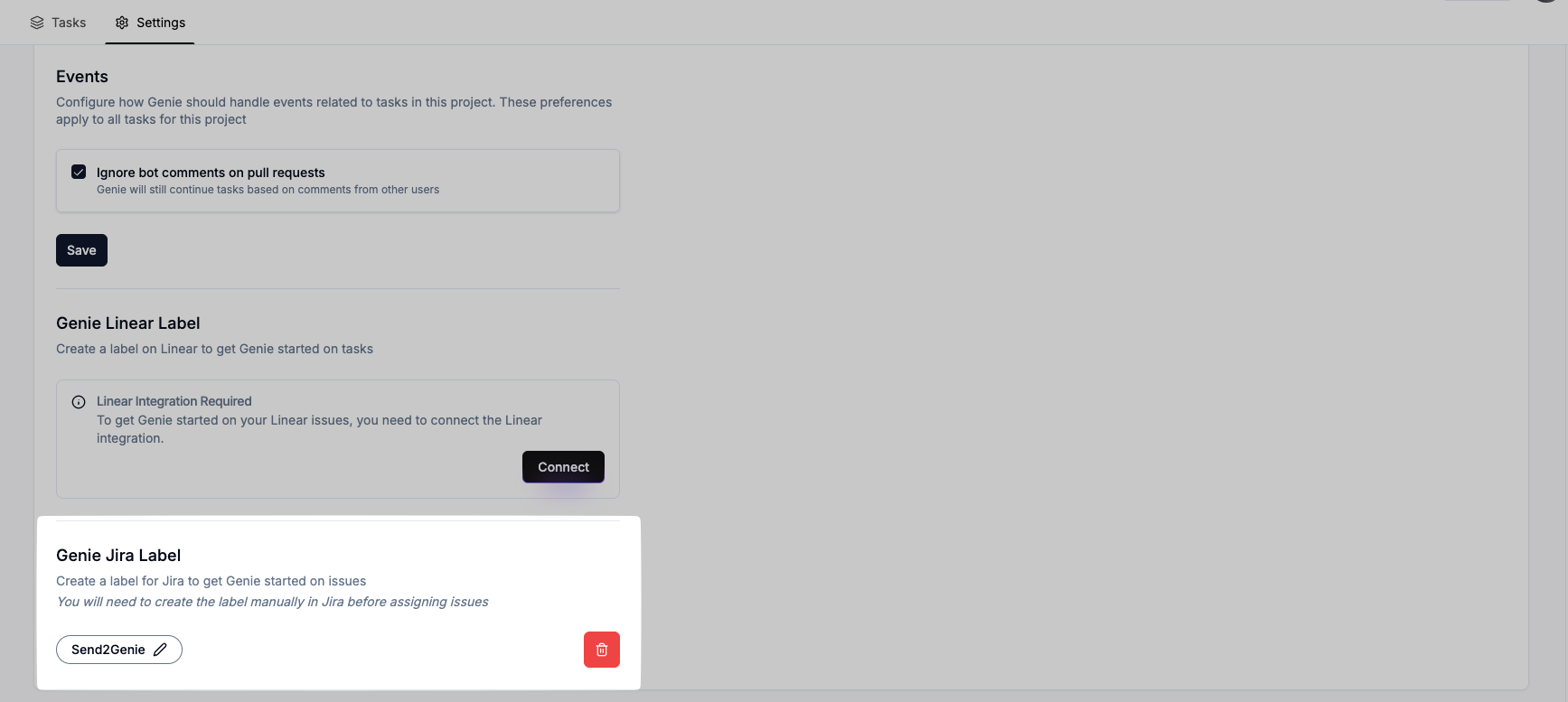 Section titled “Configuring Custom Cosine Labels”Visit Project Settings within Cosine to create, update or delete custom Cosine Jira Labels. Ensure you choose a label name unique to your Atlassian setup and installation