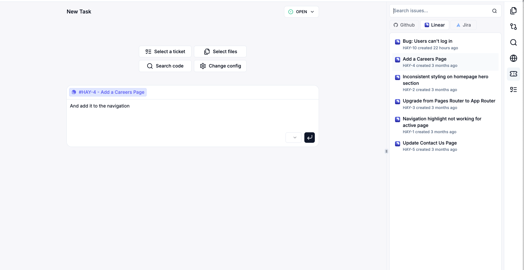 Section titled “Selecting Linear Tickets in Cosine”When creating a new task in Cosine, you can: