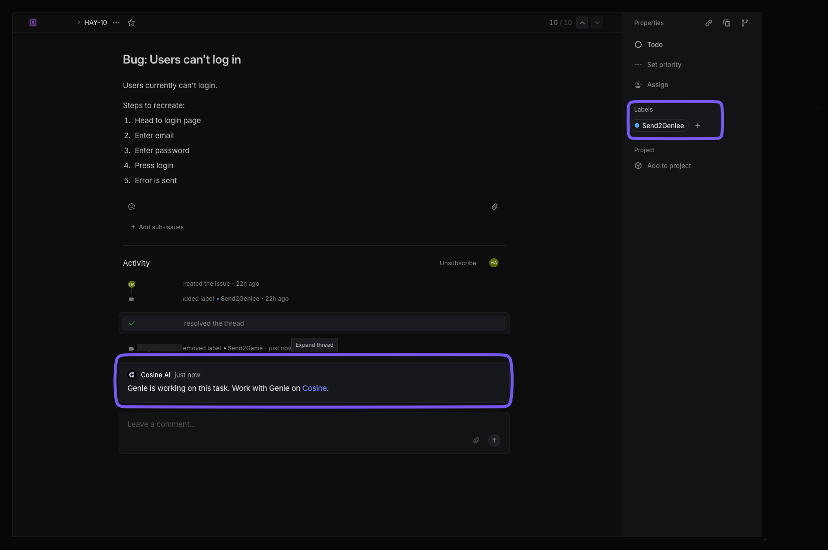 - Adding this label to any Linear ticket automatically creates a Cosine task using the ticket’s context. Cosine will also post the newly created task link to the Linear ticket, allowing others to see that a task has been created.