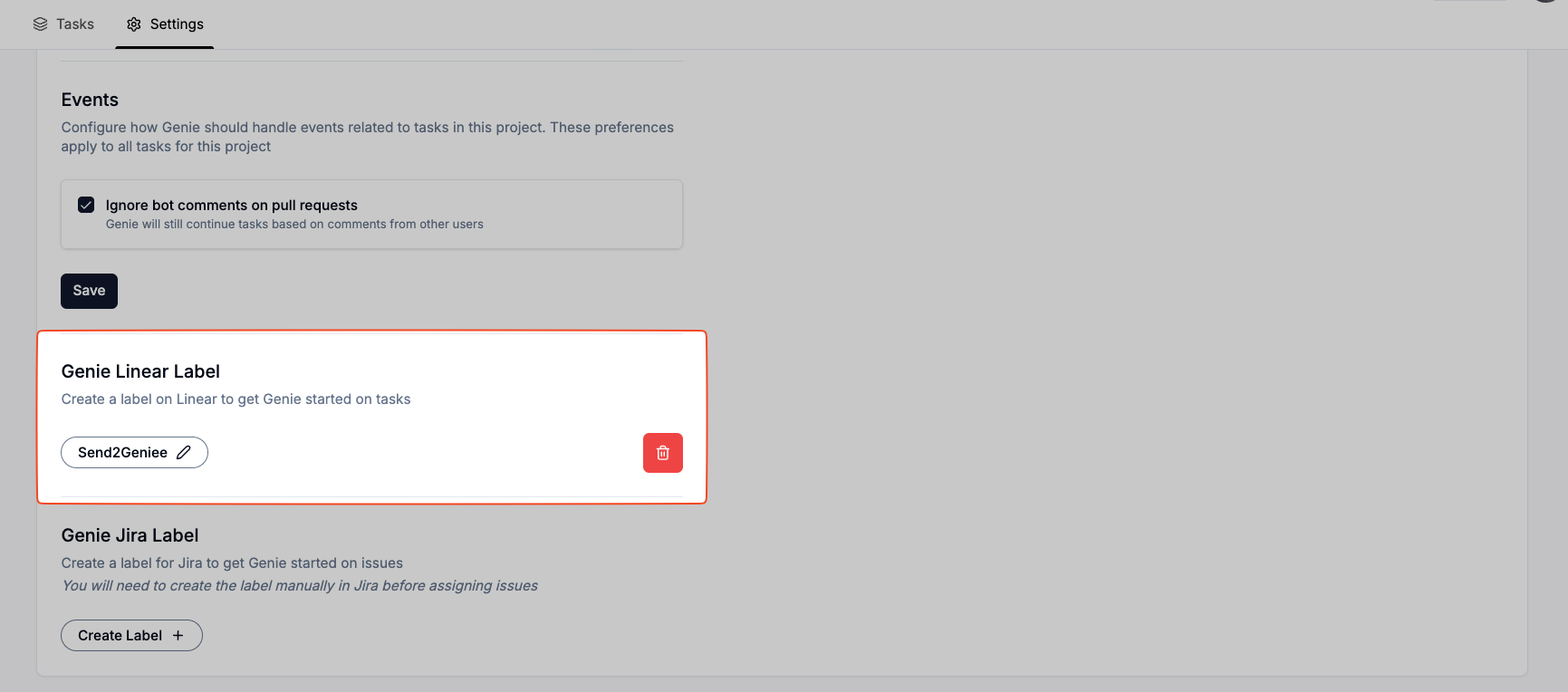 Section titled “Configuring Custom Cosine Labels”Easily manage custom labels by visiting your project’s settings within Cosine. Here you can create, update, or delete labels. Labels must be unique across your Linear instance.