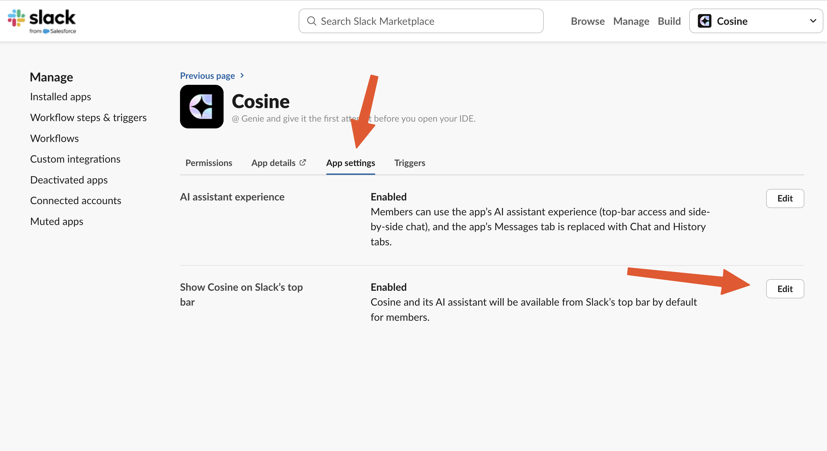 - Lastly, select App settings, and under Show Cosine on Slack’s top bar click the