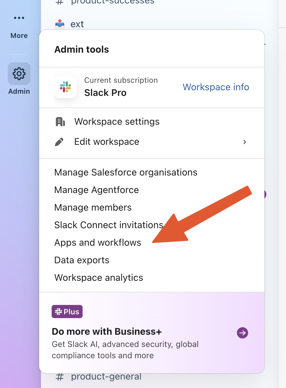 - In Slack’s desktop app, click the admin settings icon -> select Apps and workflows