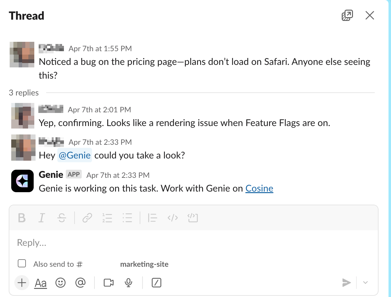 Once configured, your conversation with Cosine continues directly within Slack, allowing back-and-forth interaction and immediate feedback. View all interactions in the History tab.