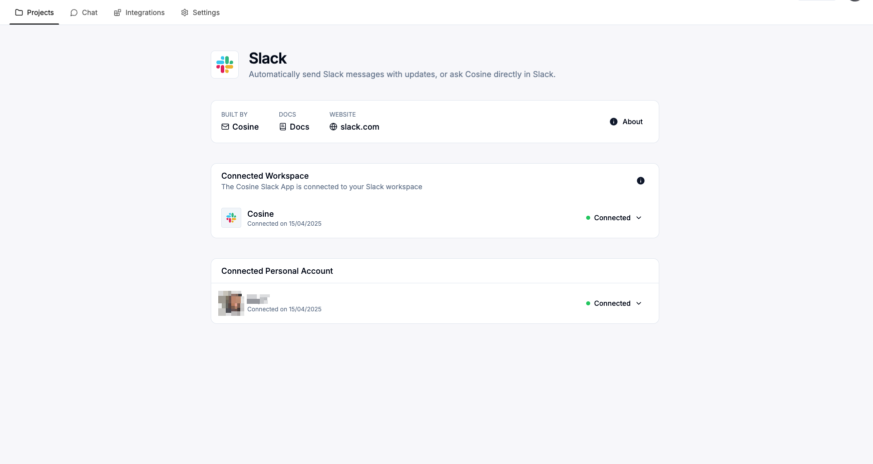 - Personal Account Linking: We strongly recommend linking your personal Slack account as well. This enables Cosine