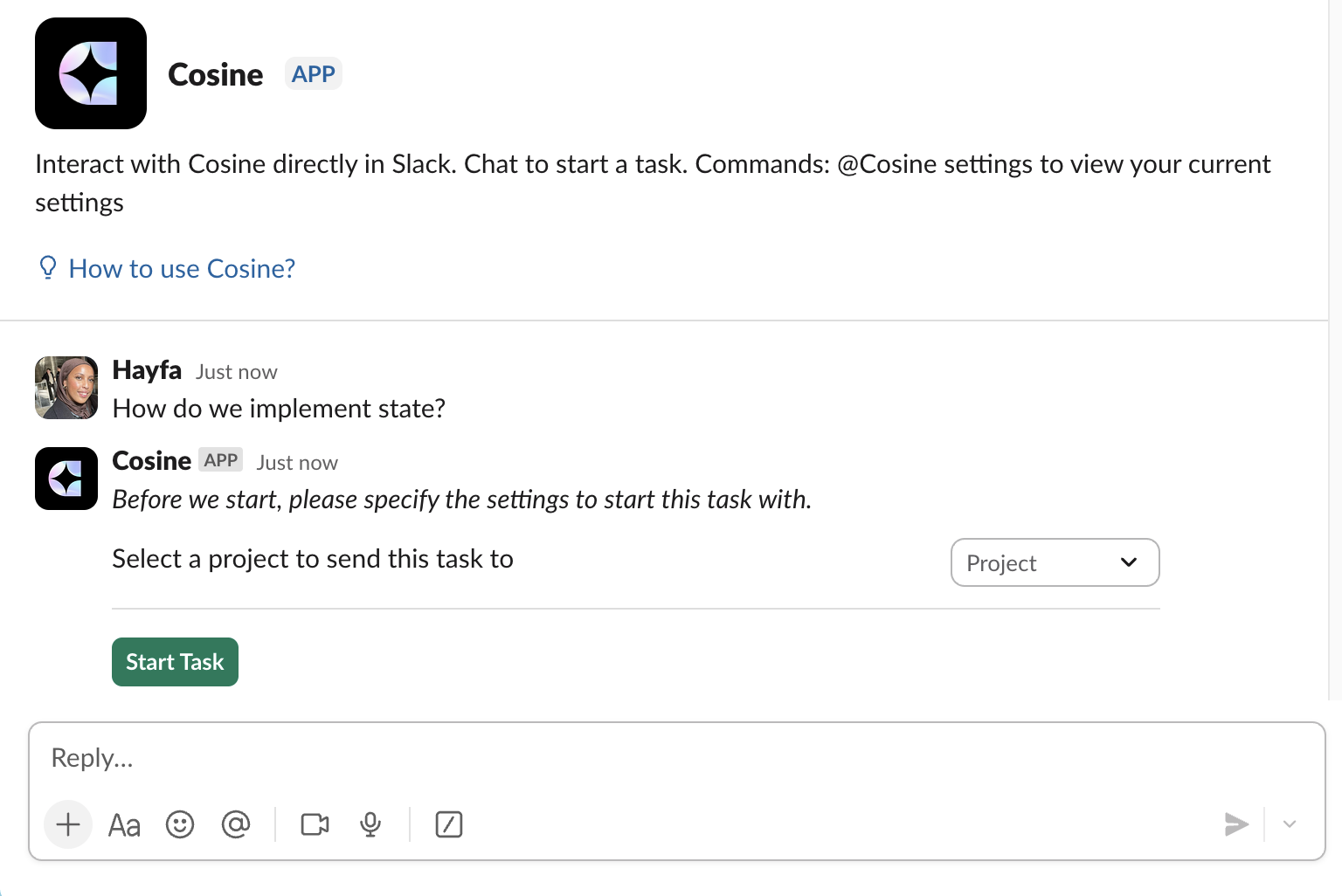 Section titled “Overview”With Cosine’s Slack integration, you can launch tasks directly from your Slack workspace by simply mentioning @Cosine. Start tasks, colloborate interactively, and get answers in real time — all without leaving Slack, so your team can stay seamlessly in-flow with its existing workflow