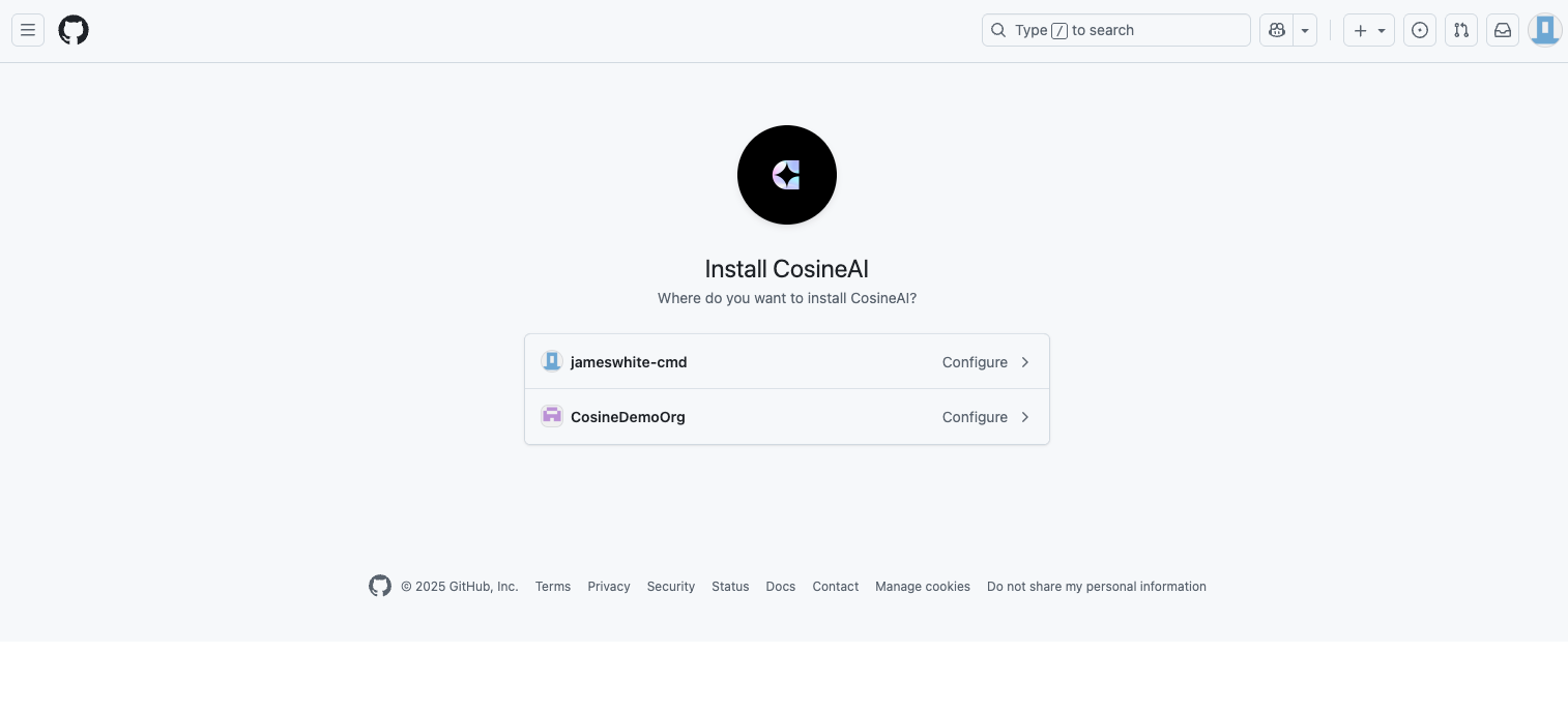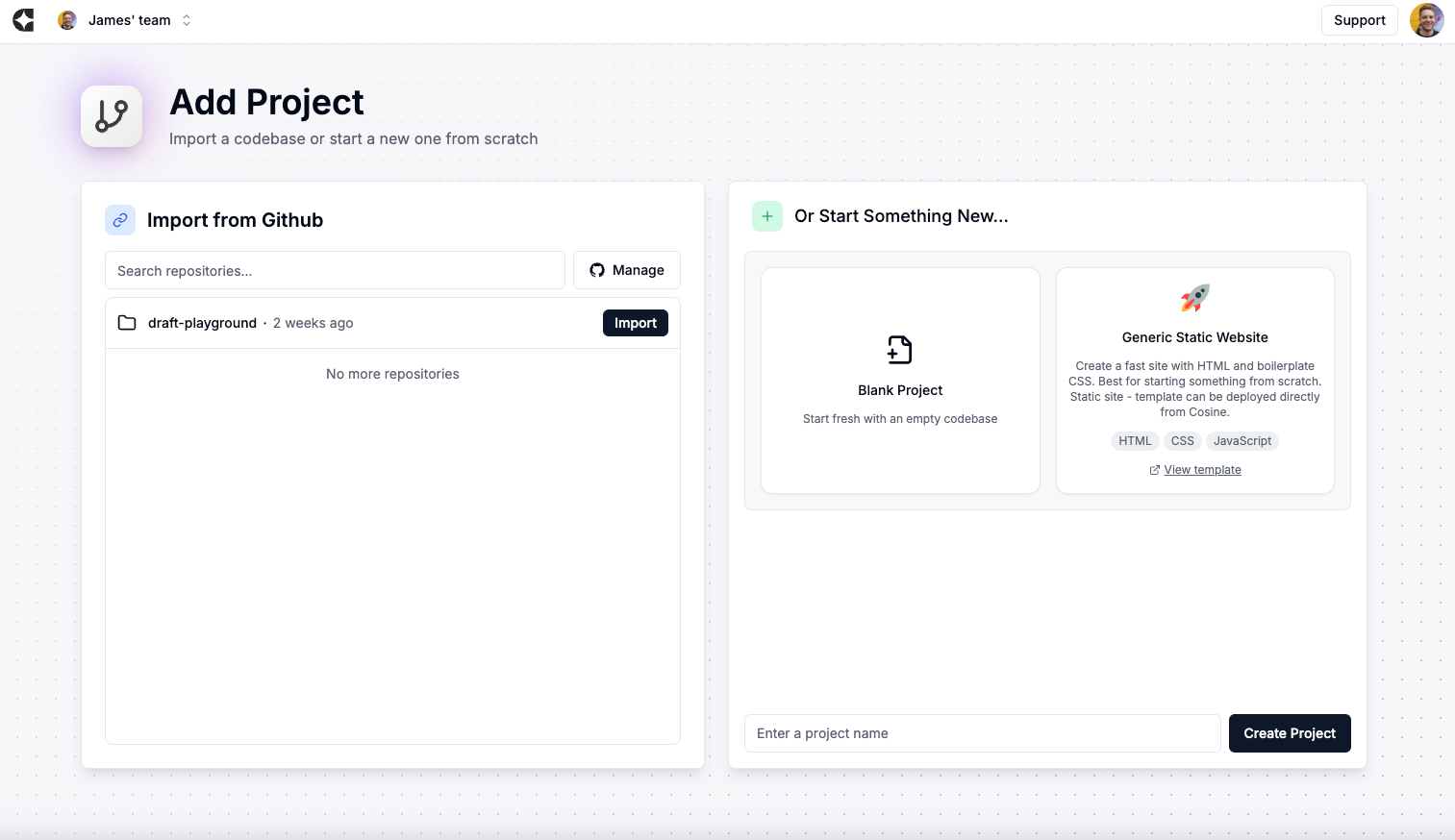 - Link your GitHub/other git provider and import one or more repos you want Cosine to work on (you can also start a new project from a template).
