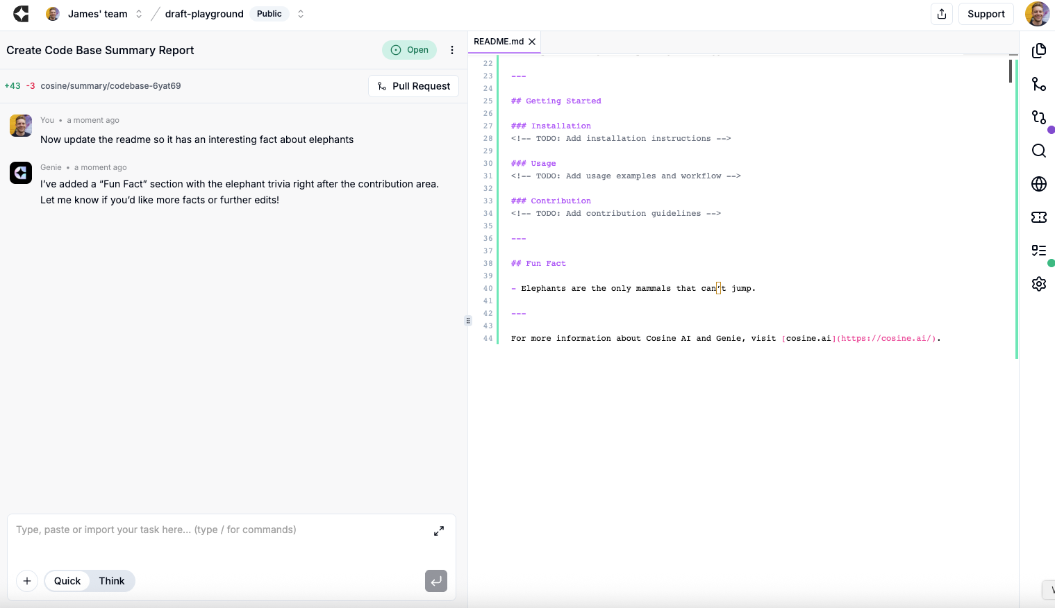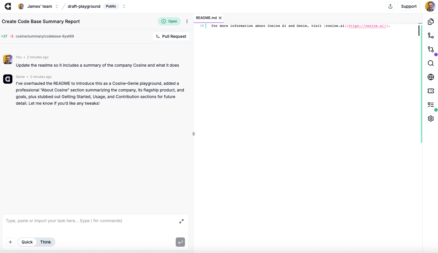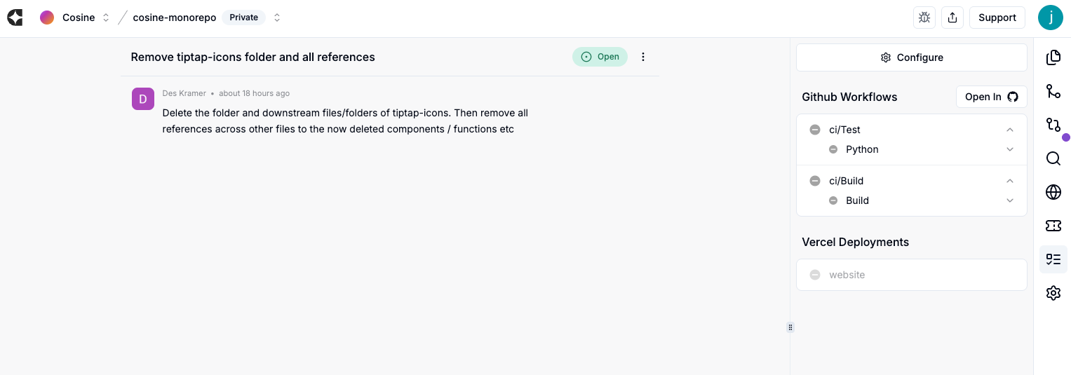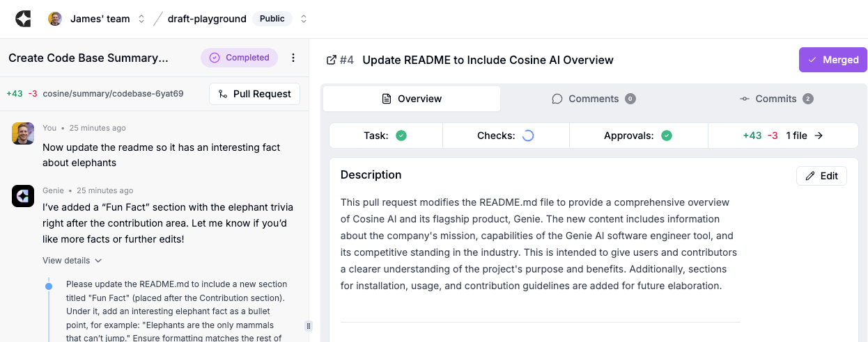 - When happy, merge the PR from Cosine or from your git host. To do this, select the PR icon on the right-hand side (second from the top) and click Merge. Done.