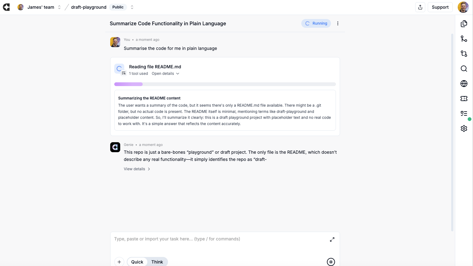 Section titled “Troubleshooting basics”- Nothing happened? Check the task page for errors; re‑submit or slightly narrow the ask.
