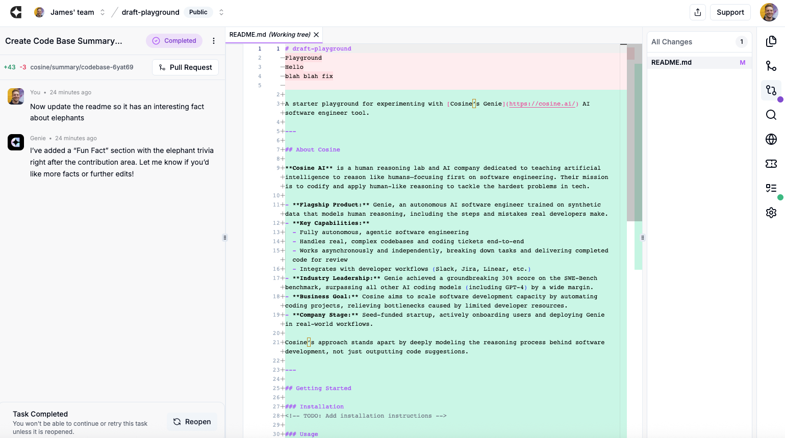 - Open the task to see what Cosine did: the plan, code changes and validation runs.