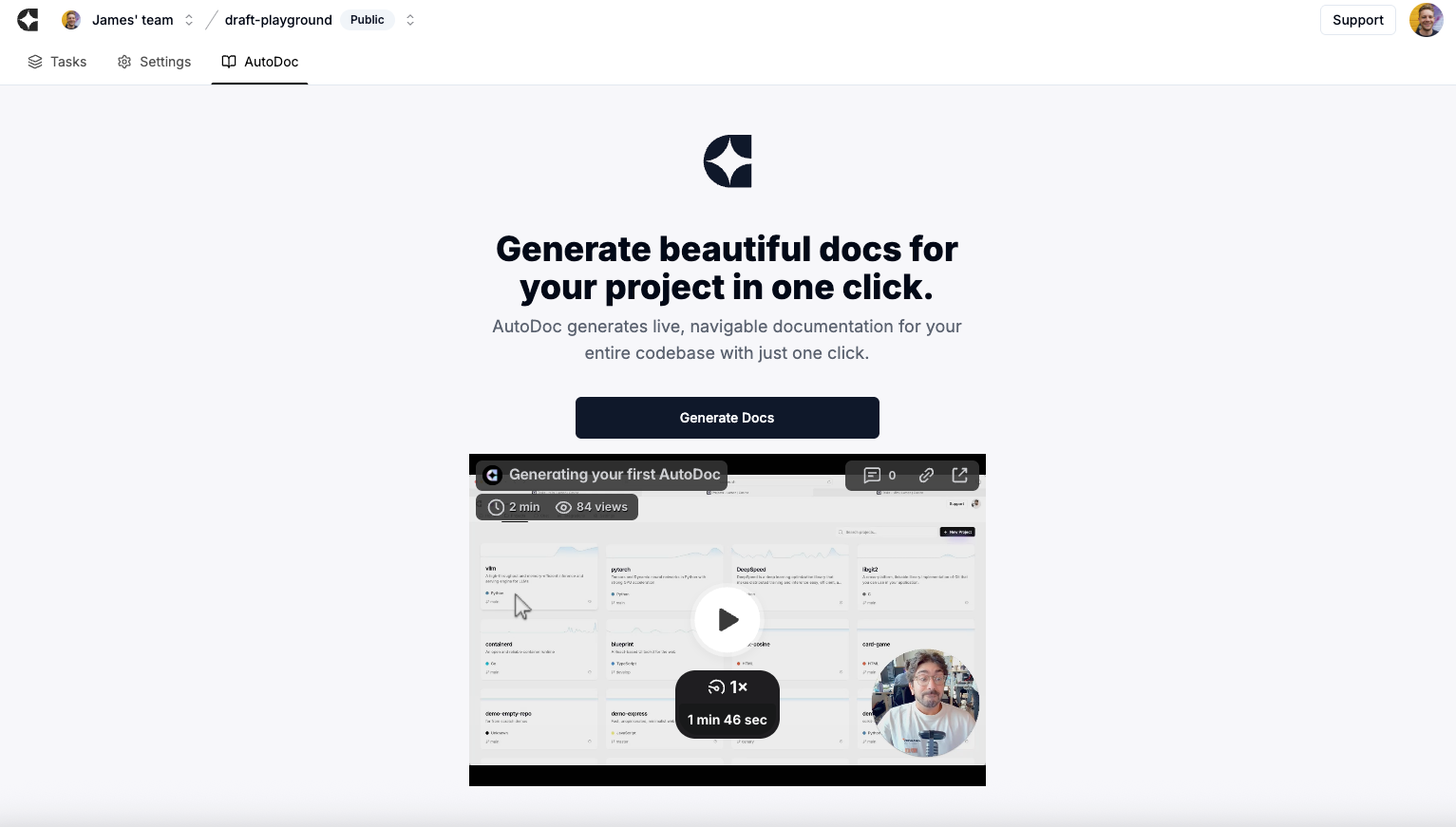Turn on AutoDoc when you want docs: It writes and keeps project docs up‑to‑date as code changes. (To do so, enter a Project and then select “Autodoc” rather than “Tasks” in the header)