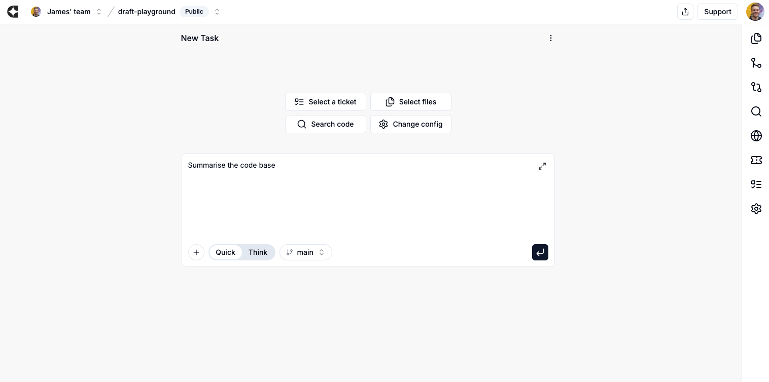 - Settings: lets you change the underlying model you’re using, and choose where to merge your PR into.