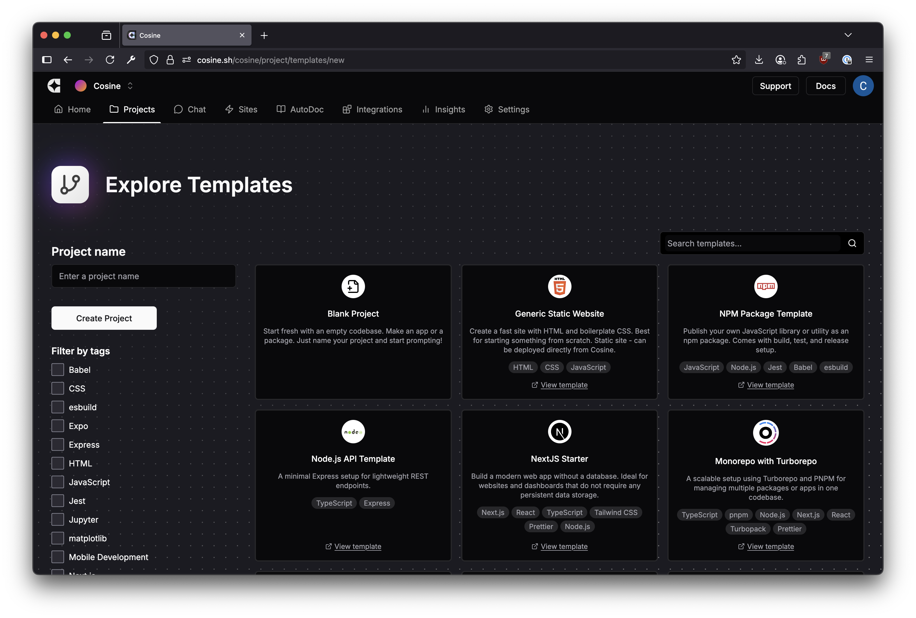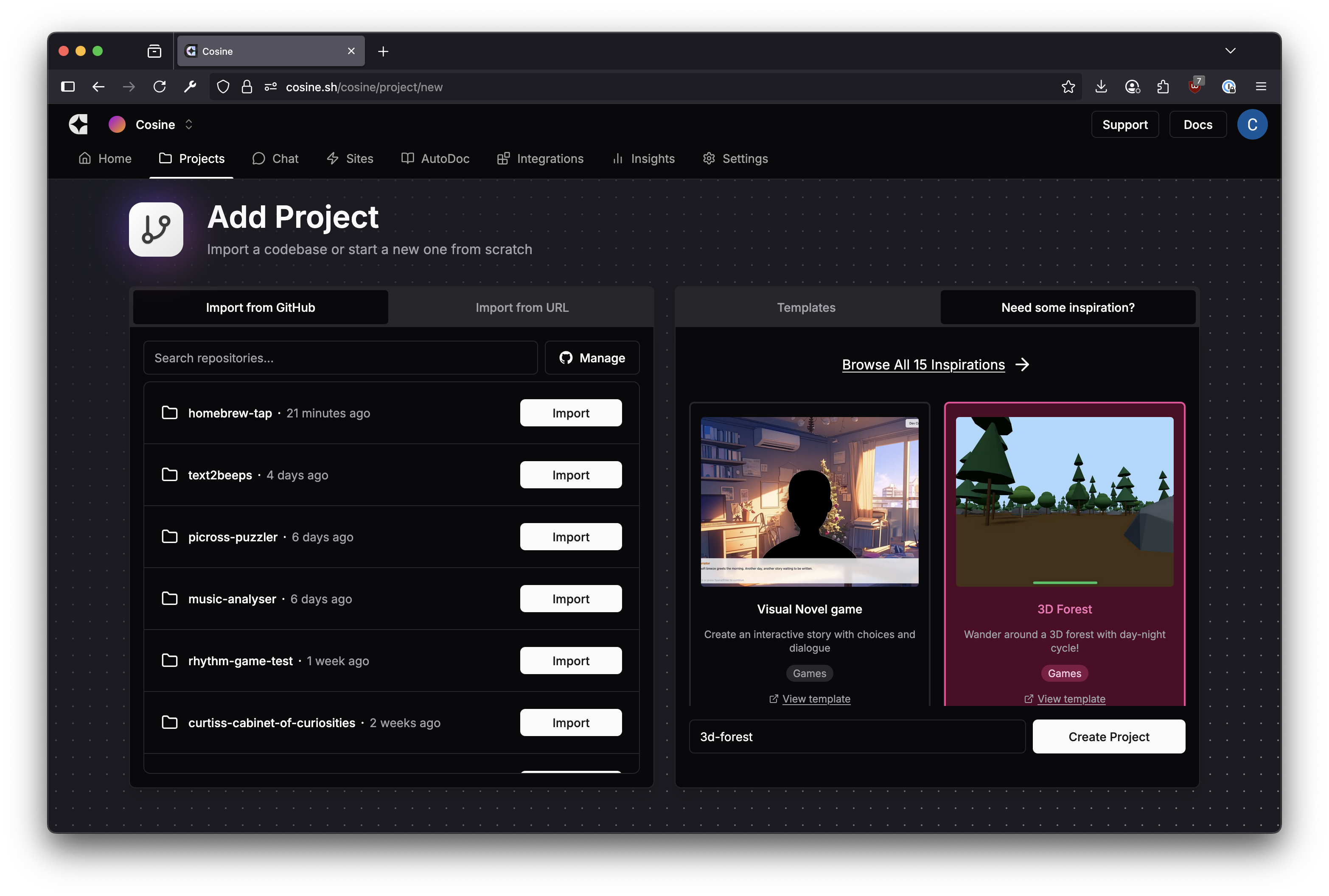 You can start something new from a pre-made template from our selection of starter projects, or even use an Inspiration. Inspirations are custom curated projects that come with settings and system prompts to create a better user experience.